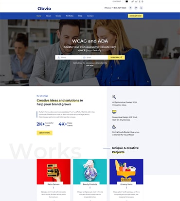 پوستهObvio از استانداردهای انطباق WCAG 2.1 ، 508 و ADA پیروی می کند و به هیچ پلاگین انطباق با WCAG نیازی ندارد. این مورد با محبوب ترین ابزارهای wave.webaim.org آزمایش شده و از جستجوگرهای تأیید قابلیت دسترسی WCAG عبور کرده است.